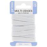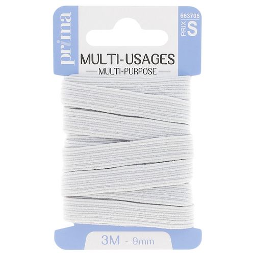 Elastique moyen multi-usage blanc. Taille 3m x 9mm. Solide et résistant, cet élastique est adapté pour la confection (ex. : resserrer les bas et poignets de vêtements de sport), l'ameublement et les loisirs. Existe en différentes largeurs : 3, 5, 6, 8 et 9 mm.