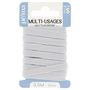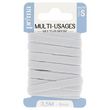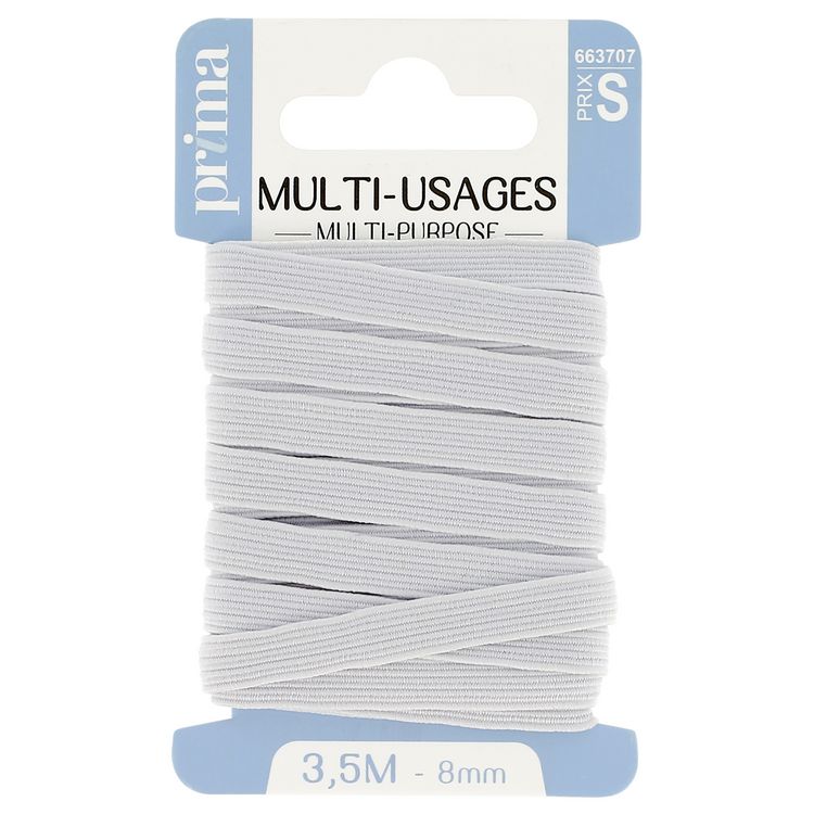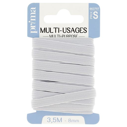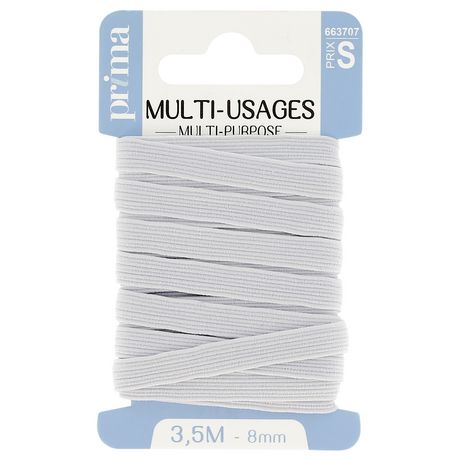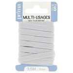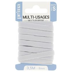Elastique moyen multi-usage blanc. Taille 3m50 x 8mm. Solide et résistant, cet élastique est adapté pour la confection (ex. : resserrer les bas et poignets de vêtements de sport), l'ameublement et les loisirs. Existe en différentes largeurs : 3, 5, 6, 8 et 9 mm.