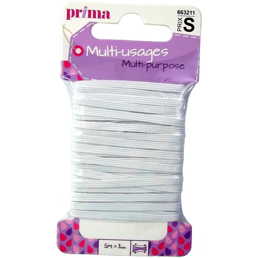 Elastique moyen multi-usage blanc. Taille 5 m x 3 mm. Solide et résistant, cet élastique est adapté pour la confection (ex. : resserrer les bas et poignets de vêtements de sport), l'ameublement et les loisirs. Existe en différentes largeurs : 3, 5, 6, 8 et 9 mm.