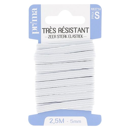 Elastique très résistant blanc Taille 2m50 x 5mm. Elastique doublé, . recommandé pour tous les usages intensifs (ex : housse de canapé, draps, housses…)