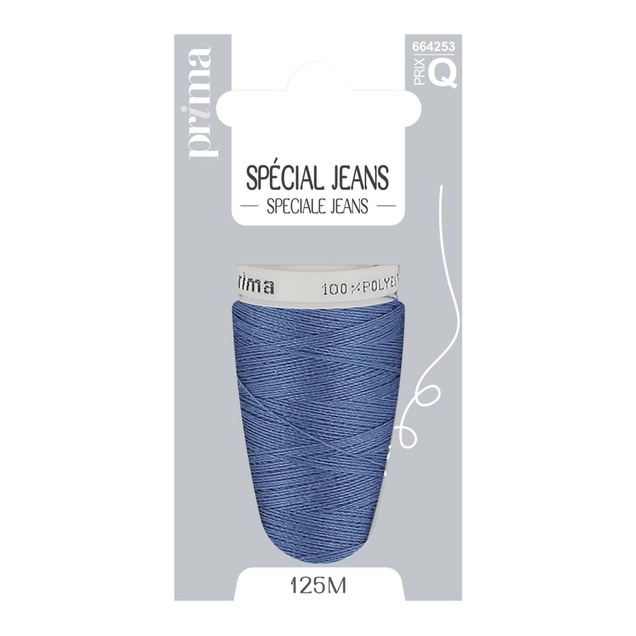 Fil spécial Jeans 125M. Recommandé pour les coutures ou retouches de vos pièces en jeans. Composé de polyester et coton il s'harmonisera dans vos tissus denim tout en gardant un haut niveau de résistance. 70% polyester et 30% coton.