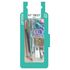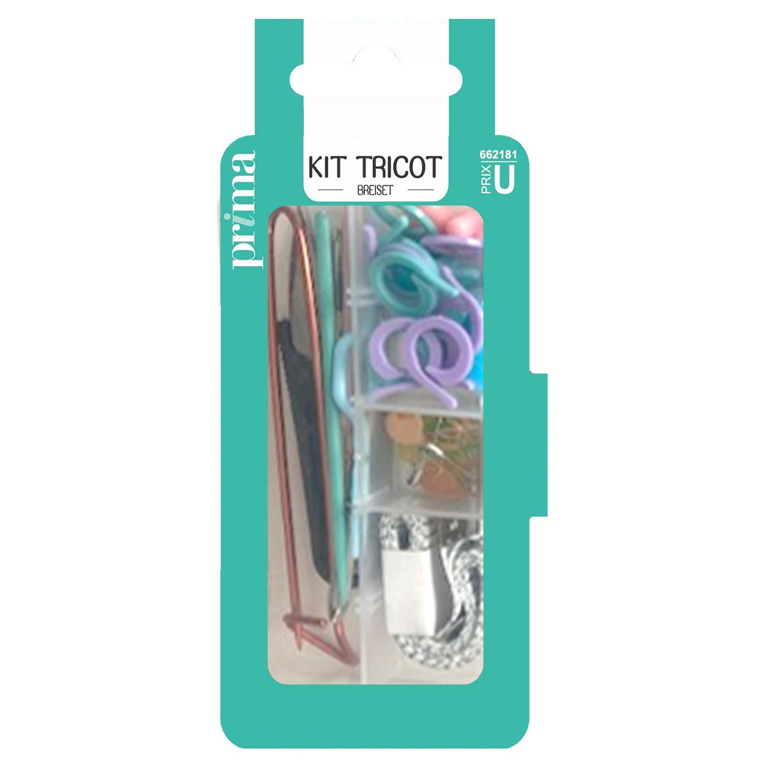 Composition du kit : 1 mètre ruban, 1 coupe fil, 1 ramasse maille, 1 aiguille passe lacet, 2 aiguilles à laine (1 en plastique et 1 en métal), 4 paires de protège pointe aiguille de deux tailles différentes, 2 aiguilles auxiliaires de deux tailles différentes, 10 épingles de sureté, 20 marqueurs maille de deux formes différentes : spirales et verrouillables.