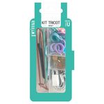 CE KIT TRICOT comprend 1 mètre ruban, 1 coupe fil, 1 ramasse maille, 1 aiguille passe lacet, 2 aiguilles à laine (1 en plastique et 1 en métal), 4 paires de protège pointe aiguille de deux tailles différentes, 2 aiguilles auxiliaires de deux tailles différentes, 10 épingles de sureté, 20 marqueurs maille de deux formes différentes : spirales et verrouillables.