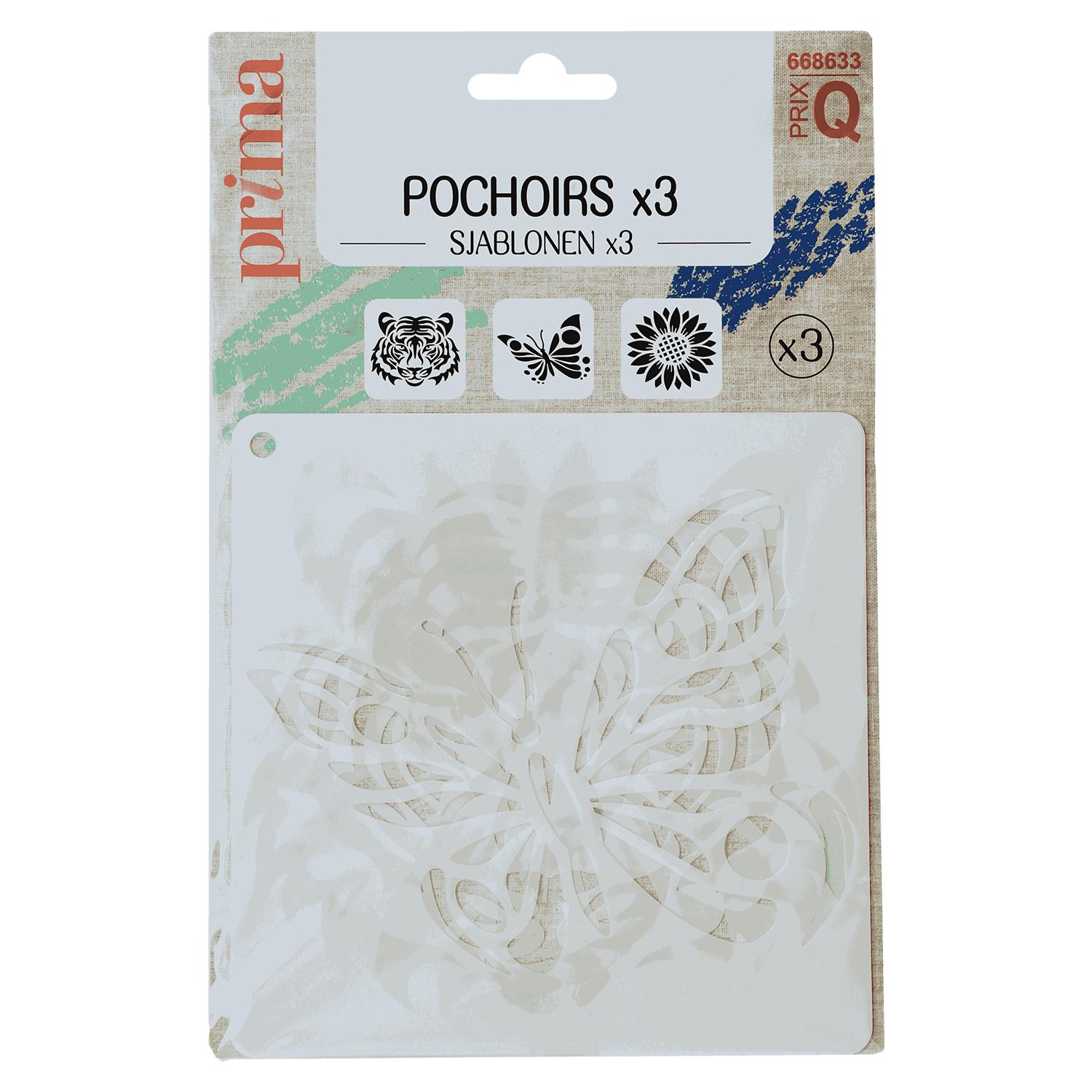 lot de 3 grands pochoirs en polyéthylène téréphtalate. 3 modèle différents : Tigre, Fleur, Papillon.