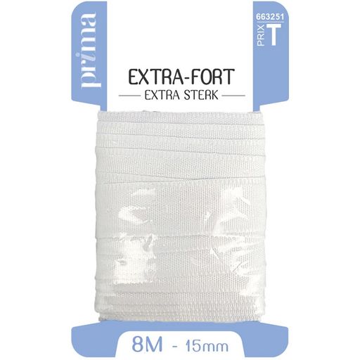 Ruban extra-fort blanc. Taille 8 m. Ruban rigide et très résistant, idéal pour renforcer un ourlet, une boutonnière, une encolure sur un tissu souple et assurer une finition impeccable. 100% polyester.