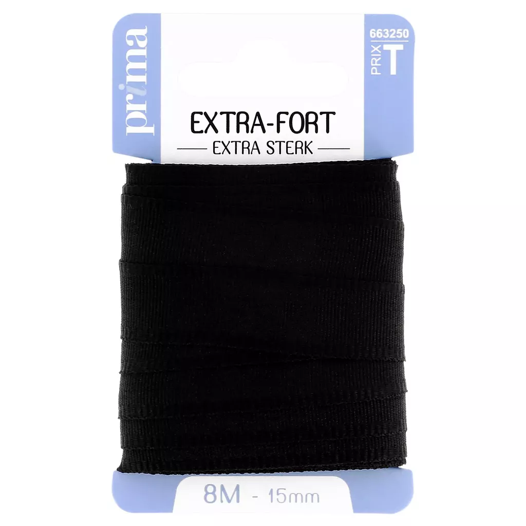 Ruban extra-fort noir. Taille 8 m. Ruban rigide et très résistant, idéal pour renforcer un ourlet, une boutonnière, une encolure sur un tissu souple et assurer une finition impeccable. 100% polyester.