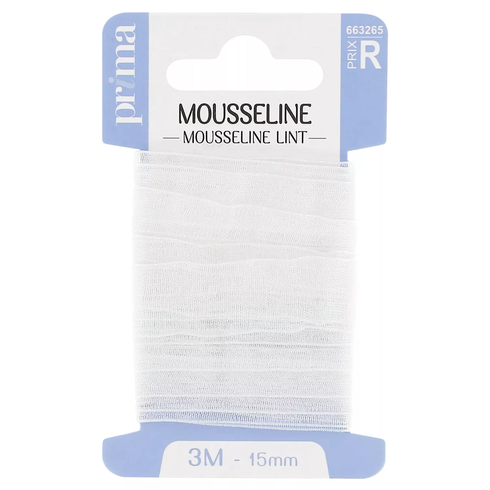 Ruban mousseline assortiment. Taille 3 m x 15 mm. Ruban idéal pour décorer : vêtements, coiffure… Existe en blanc, coloris foncés et coloris clairs. 100% Nylon.