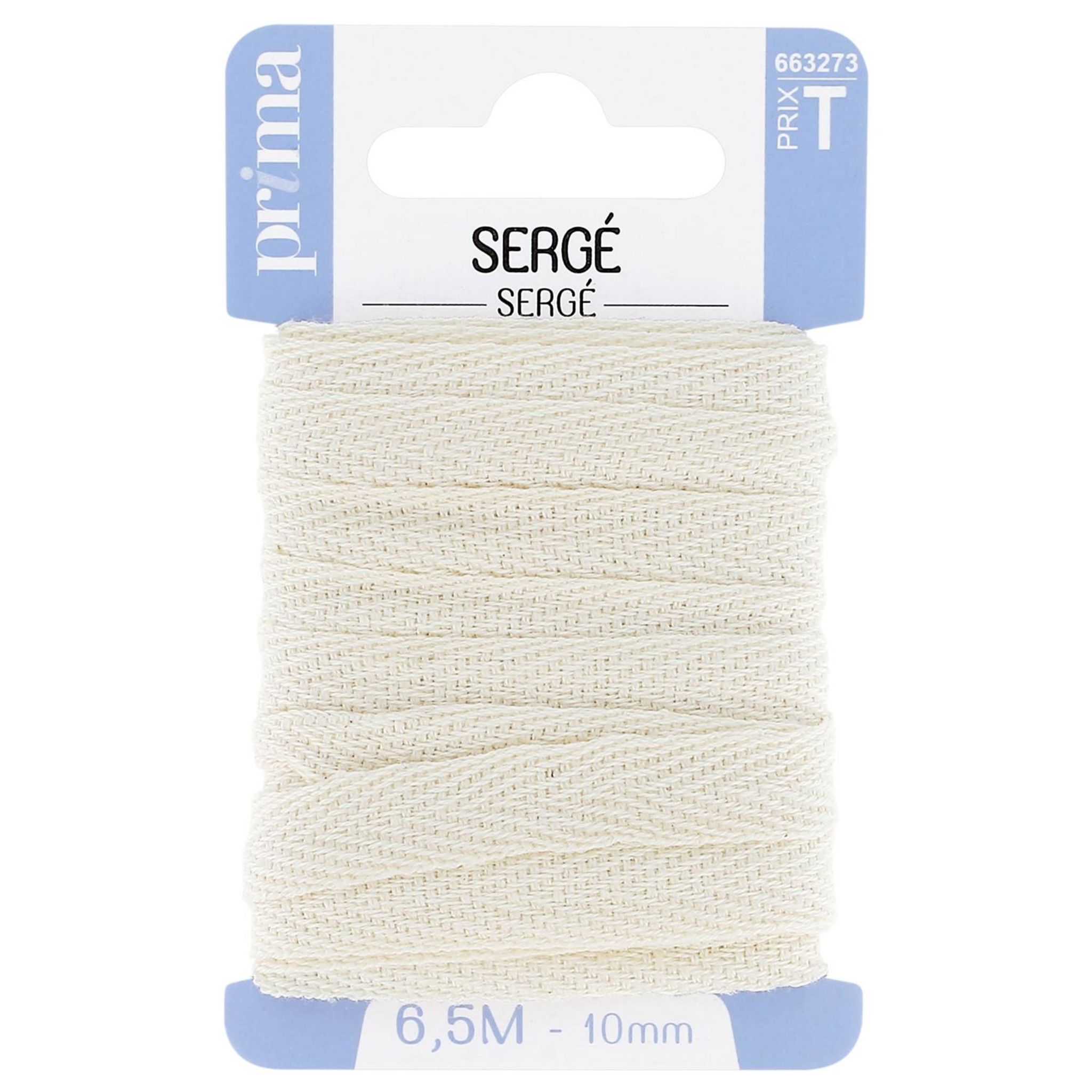 Sergé beige. Taille 6,50 m x 10 mm. Ruban idéal pour la réalisation d'accroches de torchons, de tablier ou pour la décoration. Existe en 10, 15 et 20 mm de large. 100% Coton.