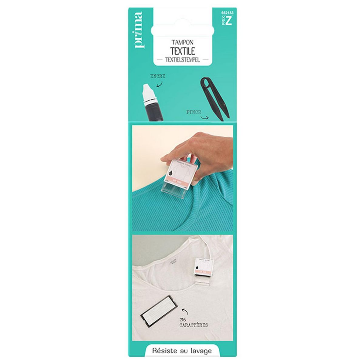 Le tampon textile vous permet de marquer vos vêtements ou ceux de vos enfants rapidement et facilement. Il contient une pince, 216 caractères, un flacon d'encre de 9ml. Possibilité d'écrire sur 3 lignes.