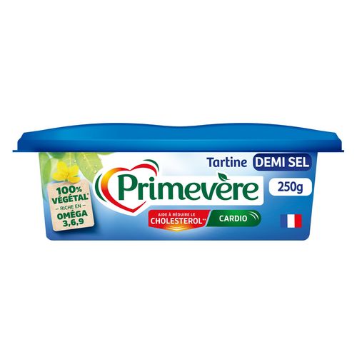 Primevère Tartine Demi-Sel, 100% végétal, est formulé avec l'Institut Pasteur de Lille. Riche en oméga 3,6,9 et vitamine B1, pour vous accompagner au quotidien face au cholestérol et participer au bon fonctionnement cardiovasculaire.