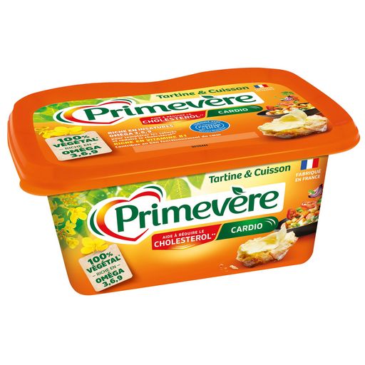 Primevère Tartine & Cuisson Doux, 100% végétal, est formulé avec l'Institut Pasteur de Lille. Riche en oméga 3,6,9 et vitamine B1, pour vous accompagner au quotidien face au cholestérol et participer au bon fonctionnement cardiovasculaire.
