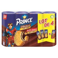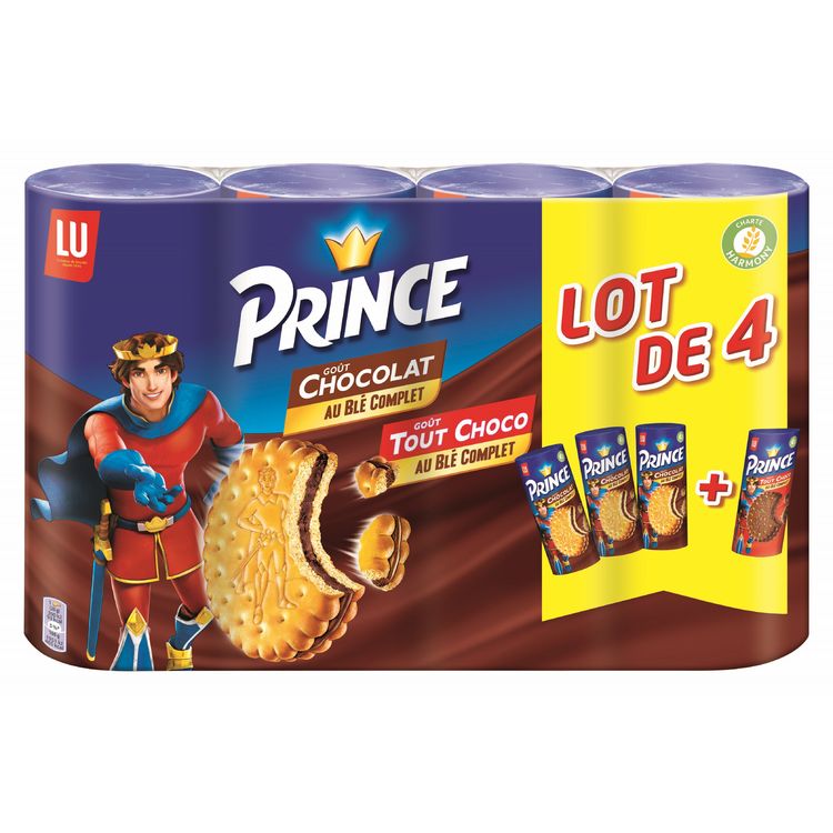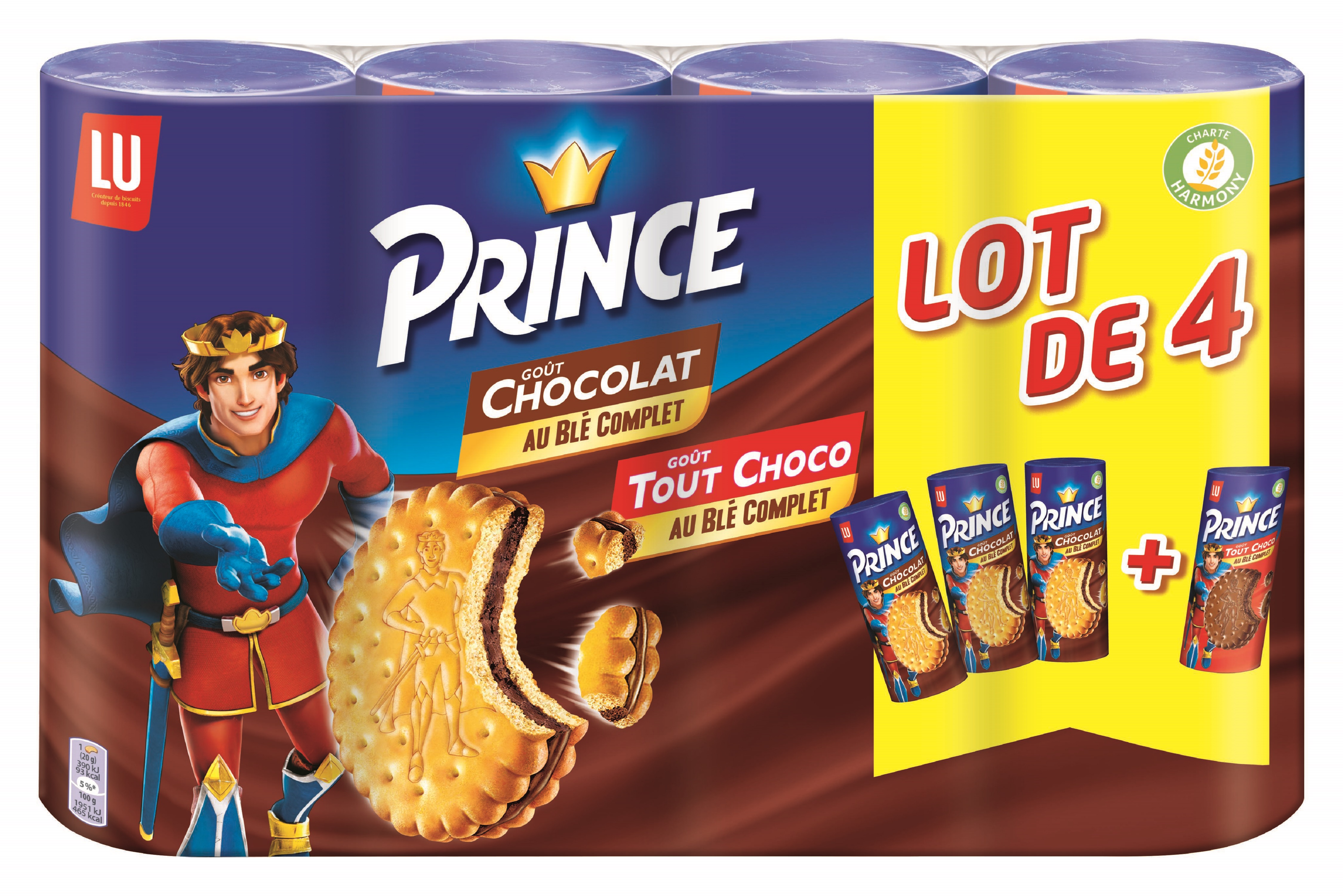 Un lot de 3 paquets Prince chocolat et 1 paquet Prince tout choco pour un max de gourmandise au goûter ! Biscuits fourrés parfum chocolat (35 %). Biscuits au cacao maigre, au lait et fourrés parfum chocolat (35 %).