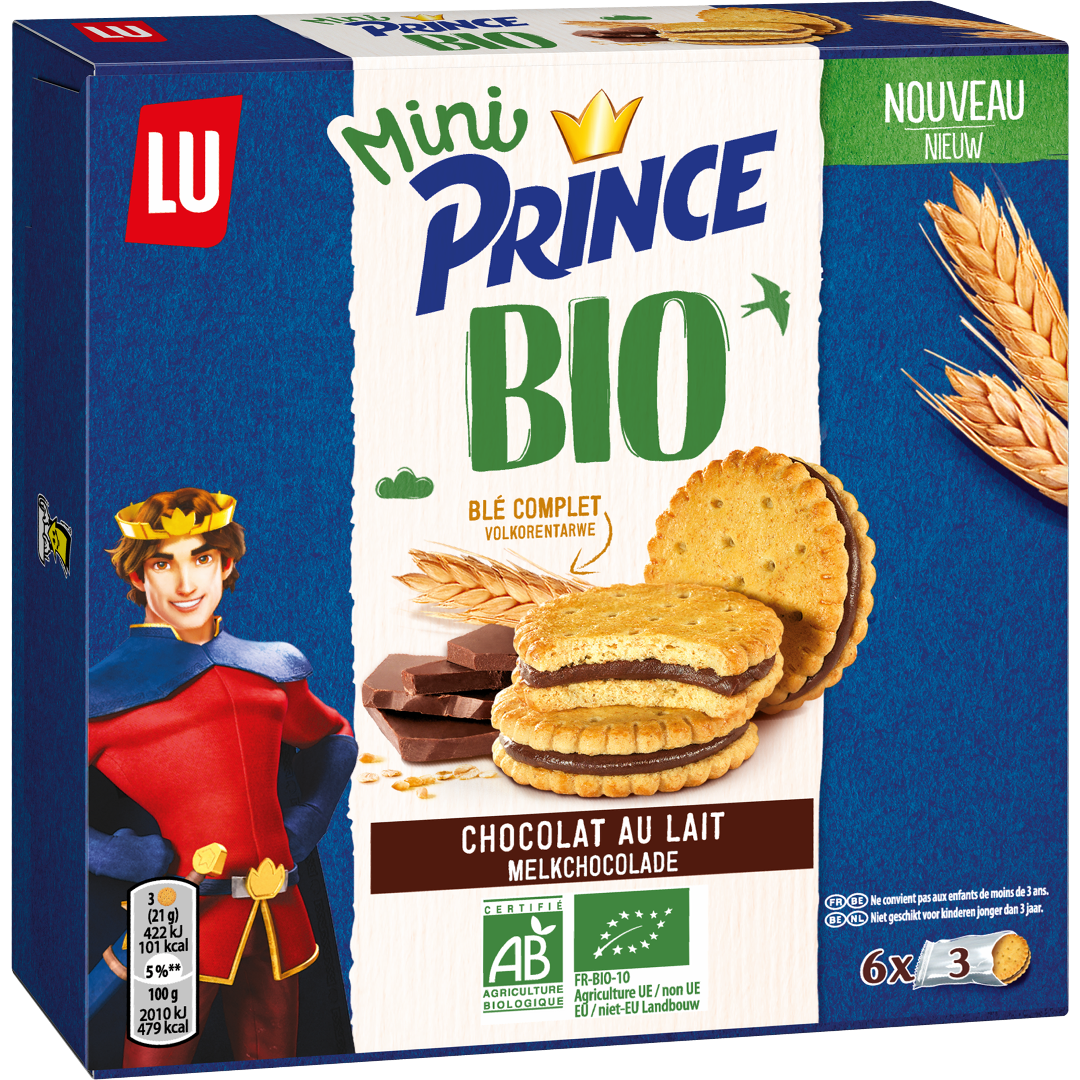 Découvrez les nouveaux biscuits Mini Prince Bio ! Une recette gourmande, avec des ingrédients de qualité issus de l'agriculture biologique. Les biscuits Mini Prince Bio c'est aussi : - Aucun colorant*, aucun conservateur*, ni arôme ajouté - Du blé complet bio et du chocolat au lait bio - Des sachets pratiques à emporter *comme l'ensemble des biscuits biologiques du marché français et belge. 1 paquet contient 6 sachets de 3 biscuits : pratiques à emporter ! Biscuits fourrés (28 %) au chocolat au lait.
