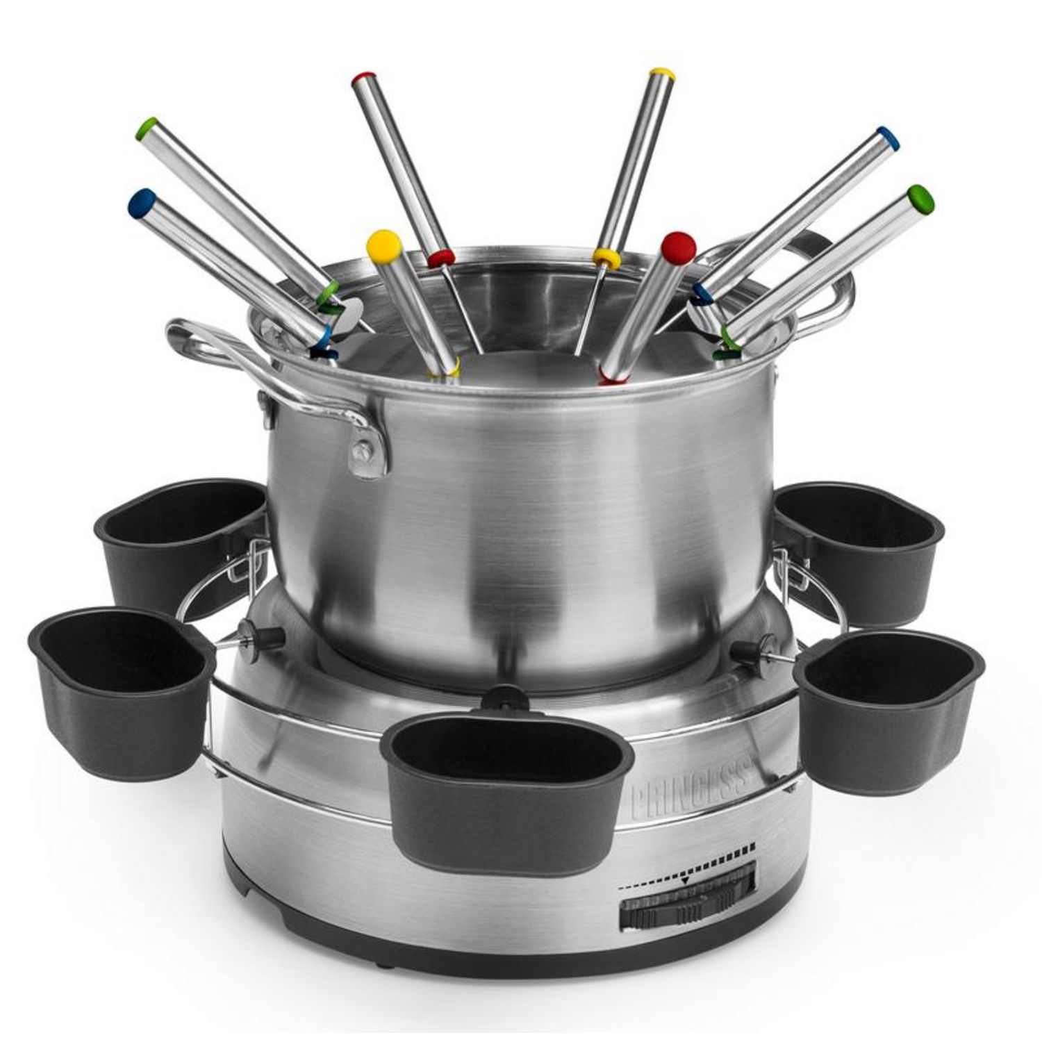 Princess 172680-01-001 Kit appareil à fondue familial 172680-01-001 en acier inoxydable. Faire de la fondue, c?est sympa, mais ça peut être un problème si vous utilisez une bougie chauffe-plats ou de la pâte à brûler. L?appareil à fondue Princess 172680 Family Fondue Set met l?ambiance à la maison. Vous pouvez facilement régler la température avec le thermostat. Cela fait que cet appareil à fondue convient aussi pour la fondue au chocolat, au fromage et la fondue bourguignonne. Le couvercle anti-éclaboussures maintient les fourchettes en place et vous pouvez présenter les sauces dans l'anneau pratique.Caquelon double paroi pour une distribution optimale de la chaleurLe caquelon en acier inoxydable a un fond à double paroi qui permet de s'assurer que la chaleur est répartie uniformément. Grâce à cela, l?appareil à fondue Princess est adaptée à la fondue traditionnelle aux fromages suisses, mais peut aussi être utilisée pour une fondue bourguignonne ou une délicieuse fondue au chocolat. Vous pouvez facilement remplir le caquelon à fondue à moitié, et aussi retirer le caquelon de la base en toute facilité.Pour 8 personnes au maximumAvec l?appareil à fondue Princess Family Fondue Set, vous recevez 8 fourchettes à fondue en acier inoxydable, ayant chacune un code couleur pour vous puissiez profiter d?une fondue avec toute votre famille. L?anneau porte-coupelles de sauce pratique peut être utilisé pour servir des sauces, mais aussi pour des garnitures sucrées pour une fondue au chocolat, comme de la noix de coco râpée ou des paillettes de chocolat. Le thermostat réglable avec une puissance de 800 W vous permet de définir la température optimale pour tout type de fondue.Facile à nettoyerGrâce au caquelon amovible et lavable au lave-vaisselle, l?appareil à fondue Princess Family Fondue Set est très facile à nettoyer. Les fourchettes et les coupelles à sauce peuvent également passer au lave-vaisselle. Vous pouvez nettoyer la base avec un chiffon doux et humide.Contenu de l'emballage :Appareil à fondue Princess Famille Fondue Set, 8 fourchettes à fondue, anneau avec 6 coupelles à sauce, mode d?emploiLes raisons de choisir l'appareil à fondue Princess Family Fondue Set :Une fondue au chocolat ou une superbe fondue bourguignonne, on peut y faire toutes sortes de fondue.Plus de tracas avec des bougies chauffe-plat grâce au thermostat réglable.Servez vos sauces et vinaigrettes dans les 6 coupelles de l'anneau.Caquelon en acier inoxydable, amovible avec fond à double paroi pour une distribution optimale de la chaleur.Facile à nettoyer grâce aux pièces pouvant aller au lave-vaisselle.