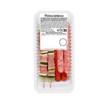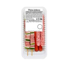 Assortiment : 2 brochettes de viande porcine saumurée, barde de porc, poivron - 4 saucisses sous enveloppe végétale : 2 chipolatas, 2 merguez.