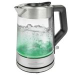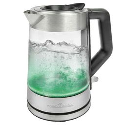 Découvrez la bouilloire électrique Proficook PC-WKS 1190 G, dotée d'une capacité de 1,7 litre et d'une puissance de 2200 W pour un chauffage rapide de l'eau. Elle dispose d'une base rotative à 360°, d'un design moderne en acier inoxydable et verre, ainsi que d'un éclairage à cinq couleurs indiquant
