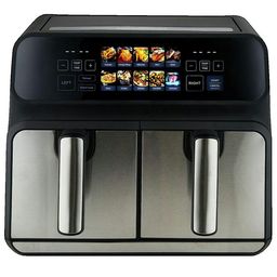 La friteuse à air ProfiCook PC-FR 1287 H Double 8L permet de savourer des aliments frits croustillants avec jusqu'à 80 % de matières grasses en moins. Elle dispose de deux zones de cuisson indépendantes de 8L (2 x 4L), permettant de cuire deux plats simultanément. Équipée d'un écran tactile numériqu