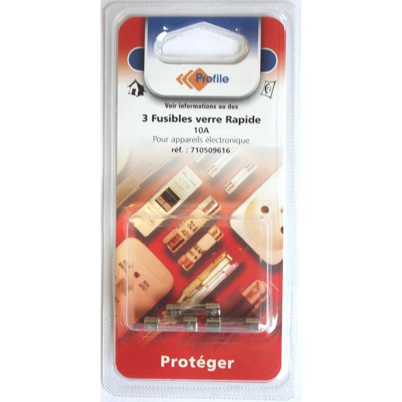 Lot de 3 fusibles rapide verre.Marque Profile.Pour les connexions de 10 ampères.Pour l'appareillage électronique.Restrictions d'usage : Coupez le courant avant toute intervention sur votre installation électrique. Débrancher votre appareil électroménager avant tout remplacement du fusible défectueux