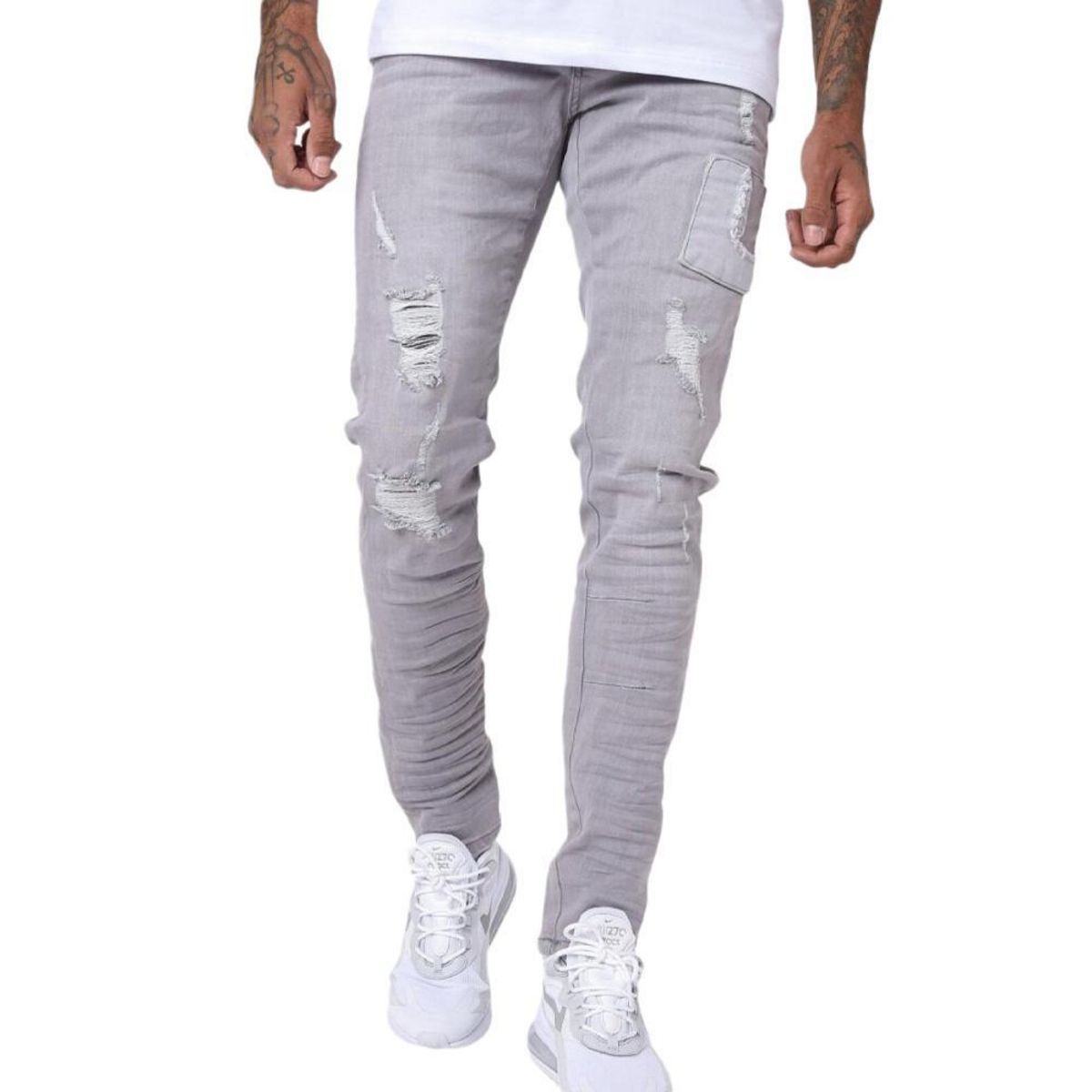Jean Skinny effet usé et grattéColoris : GrisCoupe Skinny5 poches avec détail zipFermeture boutons Effet déchiré et gratté Taches de délavage 98%Coton,2%Élasthanne