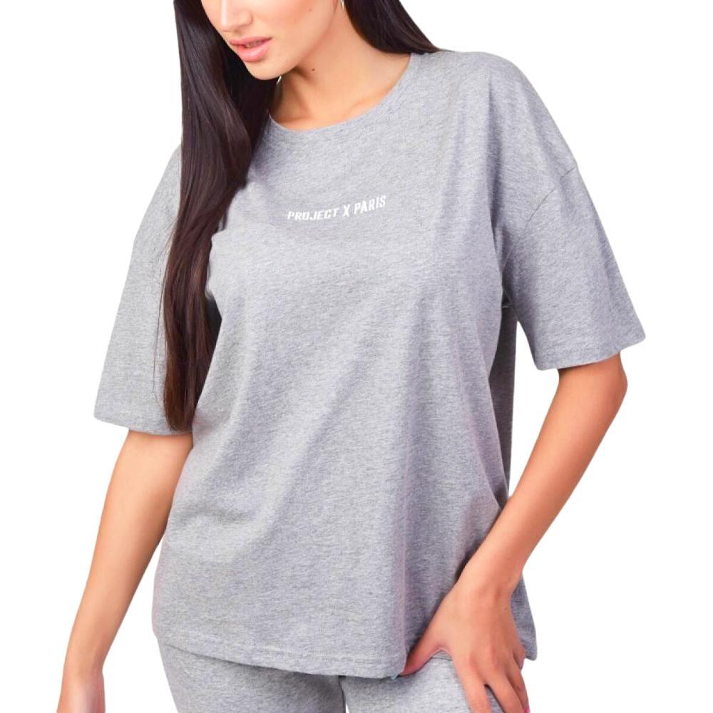 Commandez vite ce t-shirt femme de la marque Project x ParisCol rondManches courtesCoupe ampleColoris : Gris Inscription blanche brodéComposition : 88% coton , 12% polyester