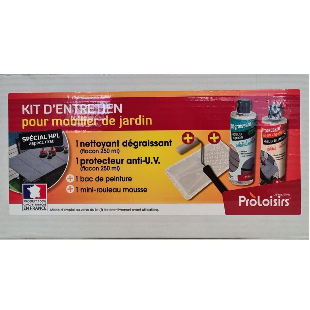 Le Kit de protection anti-UV pour HPL contient :1 Dégraissant Mobilier de Jardin.1 Protecteur Anti U.V pour HPL.1 Mini-rouleau mousse.1 Mini bac.Mode d&rsquo,emploi :Détacher au préalable les taches de gras avec le DEGRAISSANT MOBILIER DE JARDIN à l&rsquo,aide d&rsquo,un chiffon microfibre. Applique