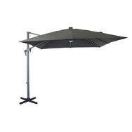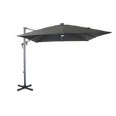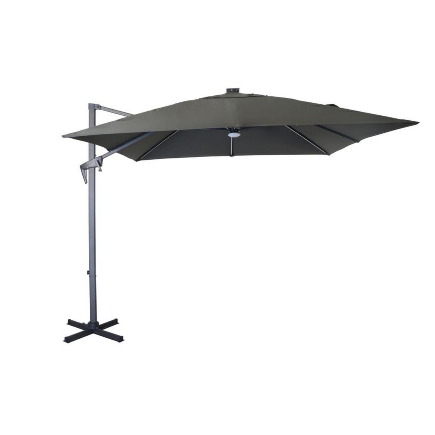 Parasol Aluminium déporté 2.7x2.7/8 baleines Alu de 14x20mmMât :48x55 mm coloris grisToile polyester 200 gr grade 6 coloris grisCapteur solaire et LedsPied en croix (sans dalles), platine tournante 360°, ouverture ManivellePoids : 25 Kg
