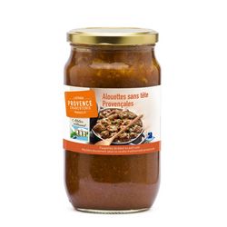 Ingrédients : Ingrédients : Alouettes (68%) (viande de boeuf (origine FRANCE), poitrine de porc (origine : FRANCE), sel, ail, persil, poivre), dés de tomates (tomates pelées, jus de tomates, sel), oignons, eau, gélatine de boeuf, carottes, amidon de tapioca, amidon modifié, vin rouge IGP de Vaucluse (SULFITES), sel, huile d'olive, double concentré de tomates (tomates, sel), fond de veau, ail en poudre, sucre, persil, épices et plantes aromatiques, poivre, herbes de Provence, champignons secs, thym, muscade, laurier.