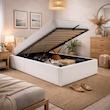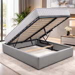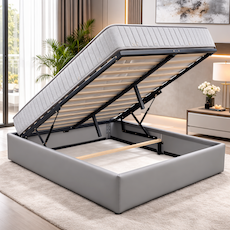 Son sommier à lattes multiplis résistantes assure un excellent maintien du matelas et favorise une bonne ventilation du couchage. Grâce à son système de vérins hydrauliques, le sommier se relève facilement pour accéder à un grand coffre de rangement intégré, idéal pour optimiser l'espace dans la chambre.