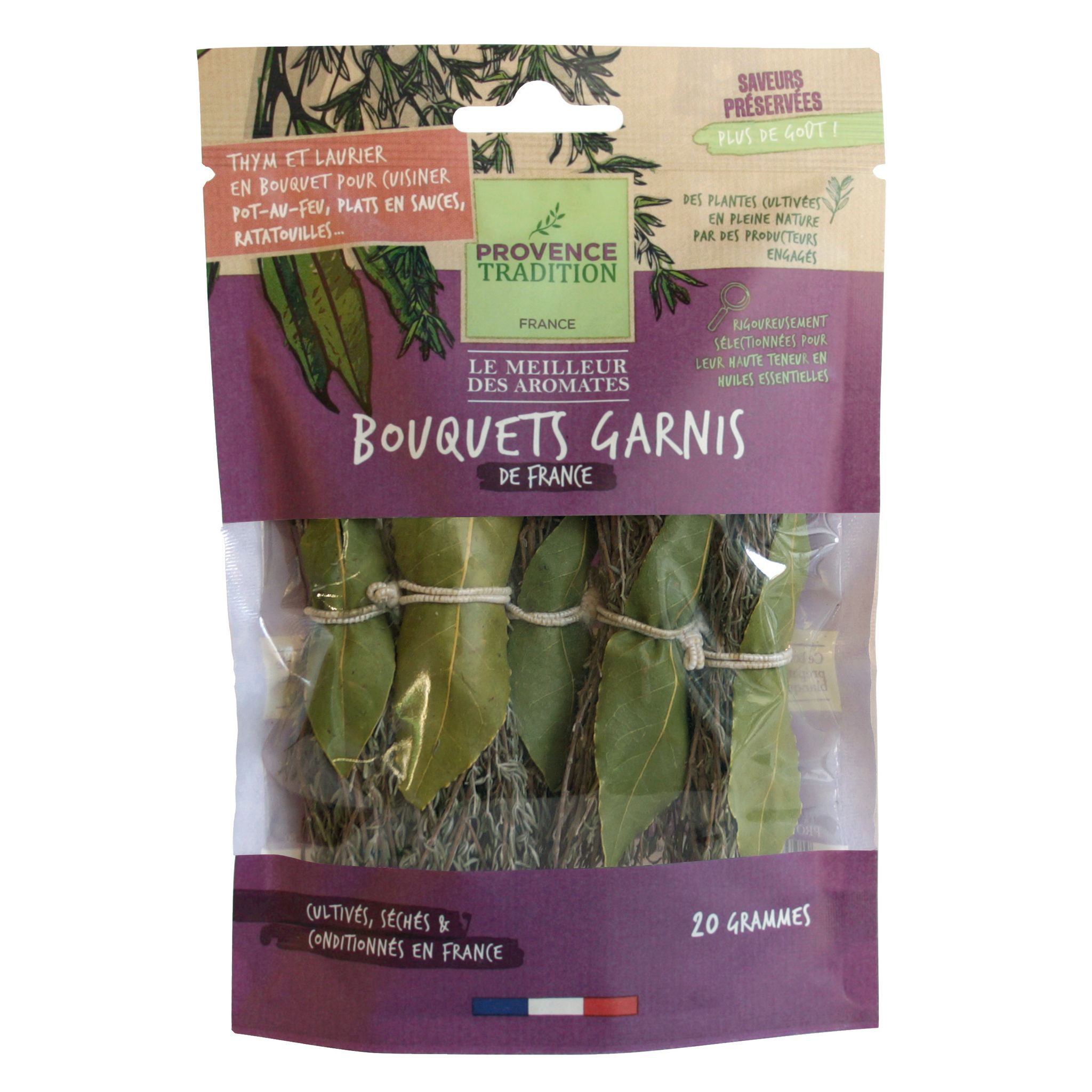 Nos bouquets garnis offrent un parfum exceptionnel. Ils sont tout prêts à plonger dans vos courts bouillons et ragoûts. Un bouquet garni suffit à enrichir savoureusement votre plat.