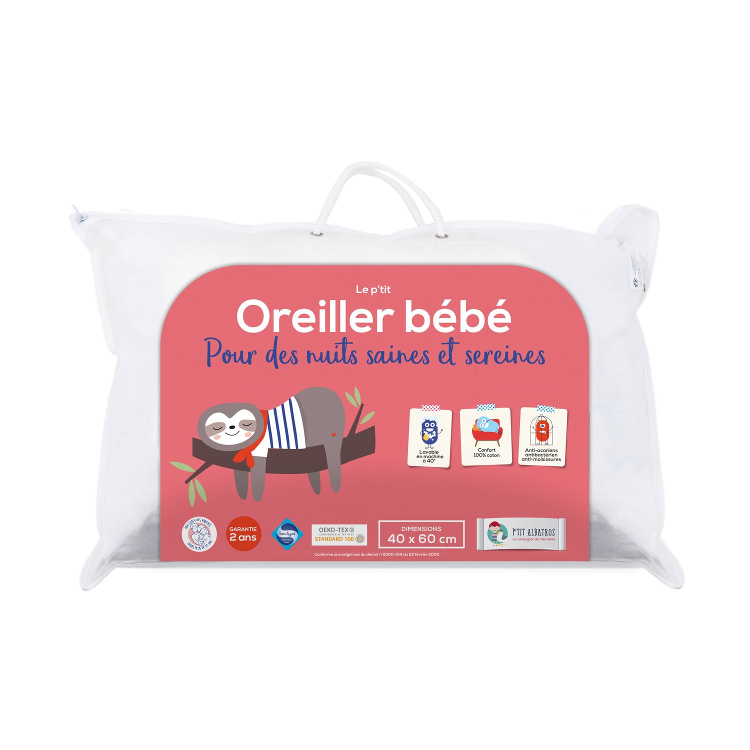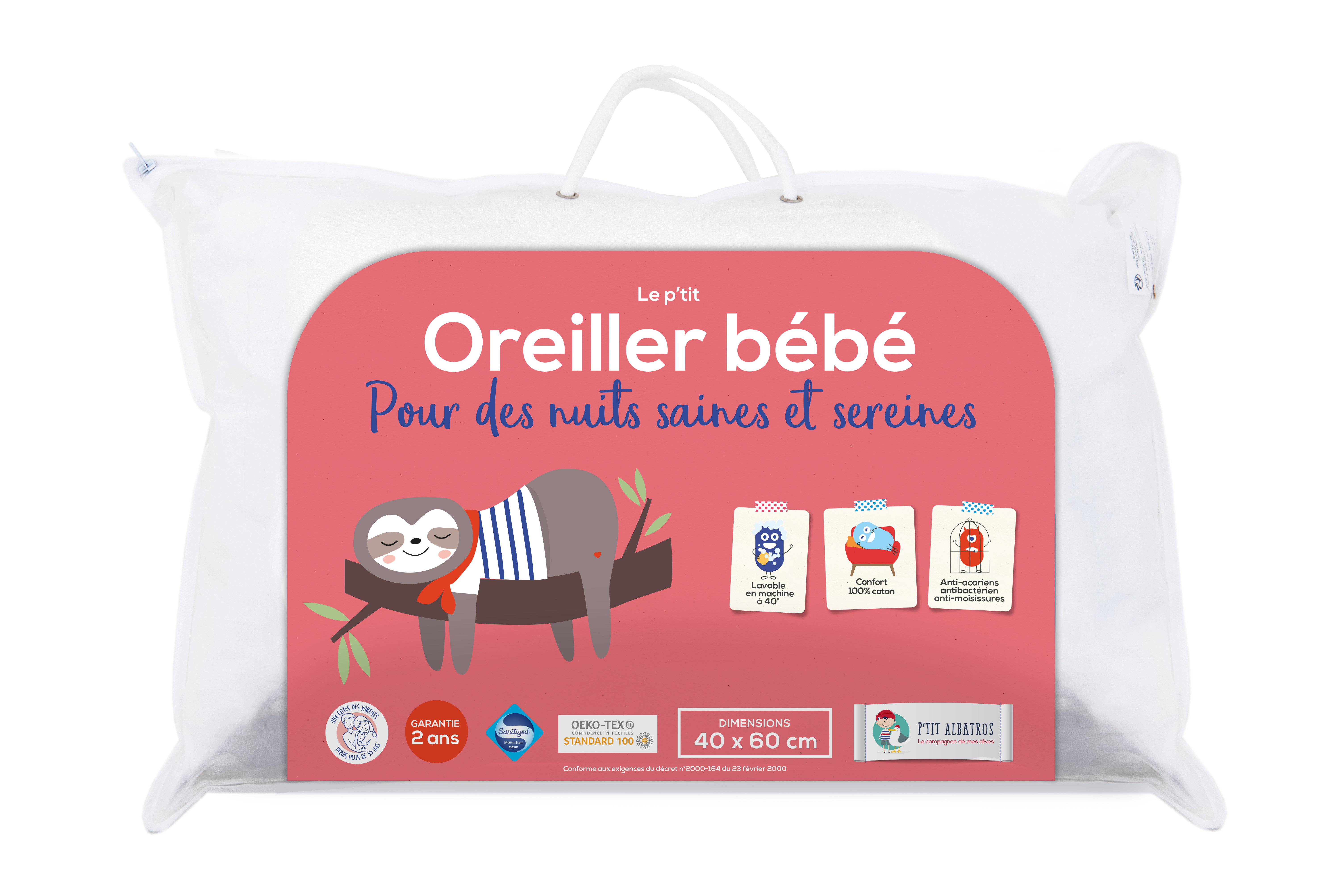 En savoir +La marque P'tit Albatros vous propose cet oreiller bébé traité Sanitized, un oreiller bébé doux et moelleux, qui protège des acariens, des bactéries et des moisissures! Facile d'entretien, il se lave en machine. Pour des nuits saines et sereines. Traitement anti-acariens, anti bactérien, anti-moisissures, traitement testé en laboratoire, totalement inoffensif pour l’homme et son environnement. Reste efficace même après de nombreux lavages. Les oreillers sont conseillés à partir de 2 ans.