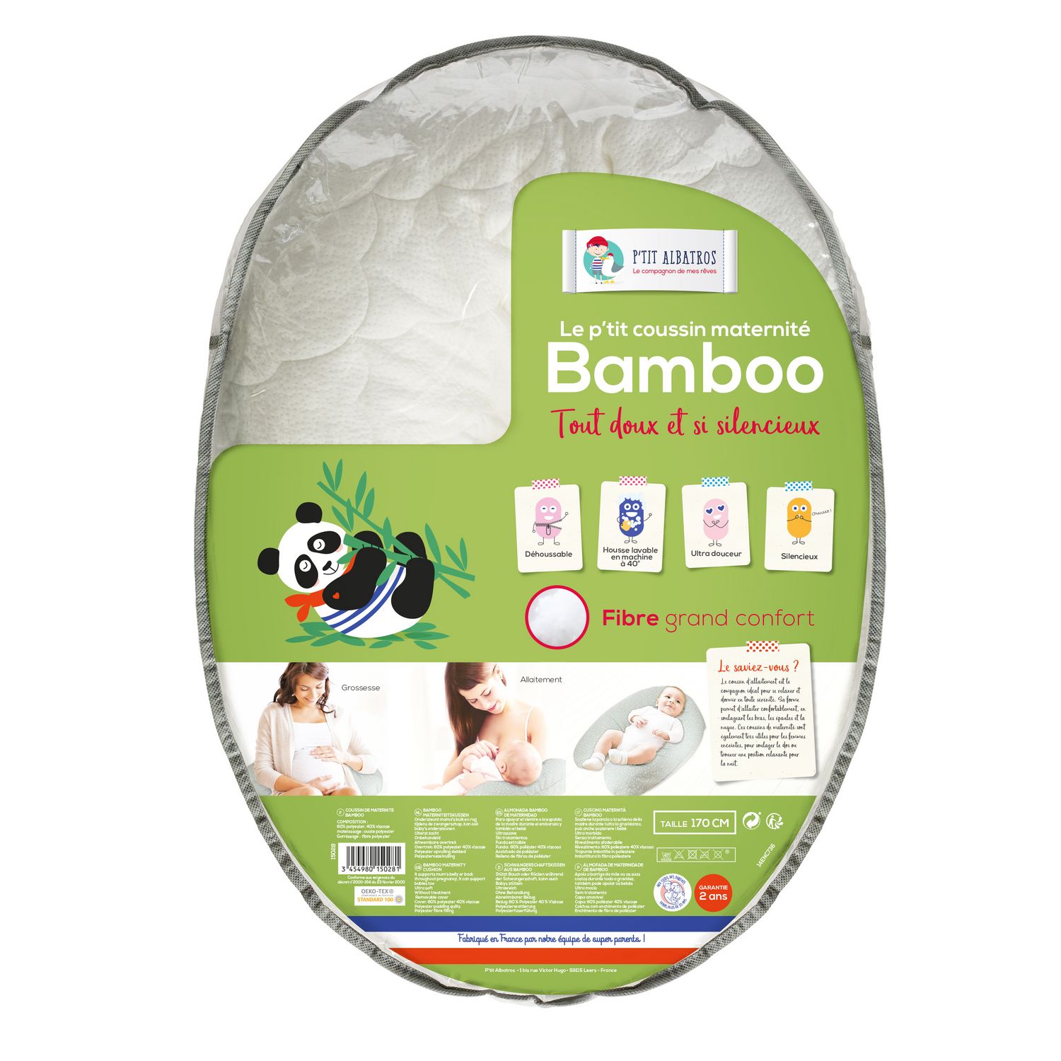 En savoir +La marque P'tit Albatros vous propose ce coussin de maternité Bamboo au toucher soyeux, moelleux, léger et silencieux. Non traité, son garnissage en fibres vous garantira un excellent confort et un bon maintien. Sans bruit pour maman et pour bébé, il soutient le dos, les jambes et le ventre pendant la grossesse, véritable compagnon de vos siestes et de vos nuits! Ce coussin maintient bébé à hauteur idéale pendant l'allaitement maternel ou le biberon. Déhoussable et lavable en machine, pour une hygiène parfaite. Fabrication française. Garantie 2 ans.