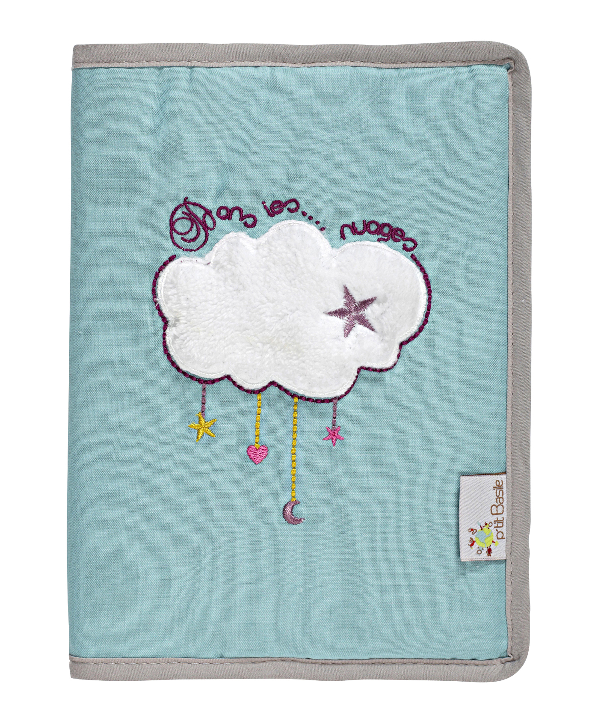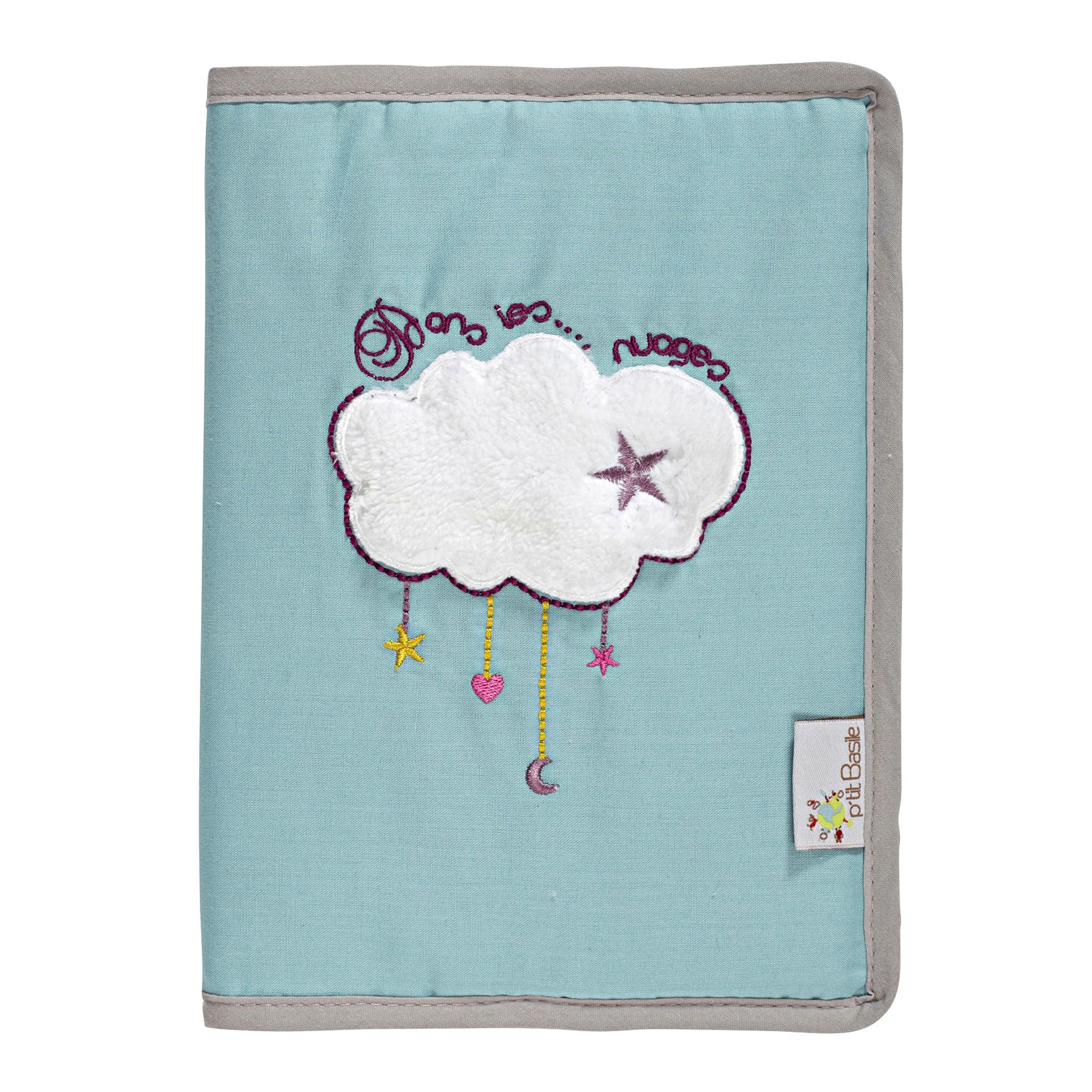 P'tit Basile a dessiné pour bébé ce joli protège carnet de santé de la collection "Dans les nuages". Il a été conçu en coton 100% issu de l'agriculture biologique, certifié selon les standards internationaux et reconnus GOTS. Avec ses coloris tendances et mixtes gris perle et bleu céladon, sa broder
