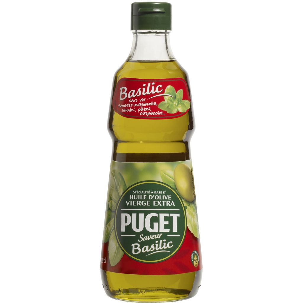Spécialité à base d'huile d'olive vierge extra aromatisée basilic PUGET Basilic est un savoureux mariage entre le fruité de l’huile d’olive vierge extra et la fraîcheur de l’extrait naturel de basilic.