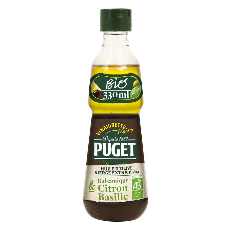 Eau, huile d'olive vierge extra* (16%), huile de colza* (16%), condiment balsamique blanc* (vinaigre de vin blanc*, moût de raisin concentré*), vinaigre balsamique de Modène IGP* (8,8%) (vinaigre de vin*, moût de raisin concentré*), basilic* (4%), citron* (2,8%), sel, épaississant : gomme xanthane.