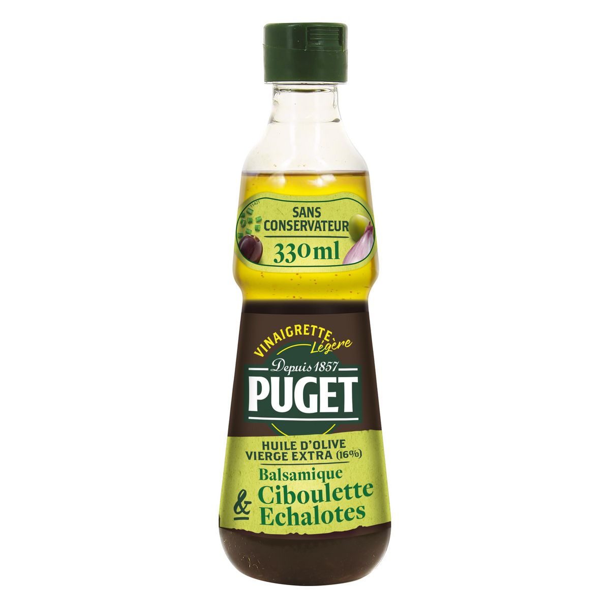 "La vinaigrette légère vinaigre Balsamique, ciboulettes & échalotes et huile d'olive vierge extra (16%) PUGET est allégée en matières grasses*. Une vinaigrette qui allie l'huile d'olive, la puissance aromatique de l'échalote et la fraicheur de la ciboulette. Idéale pour assaisonner une salade ou des crudités ! Une recette sans conservateur ! Produite en France. *57% de matières grasses en moins par rapport à une vinaigrette classique à 75% de matières grasses. "