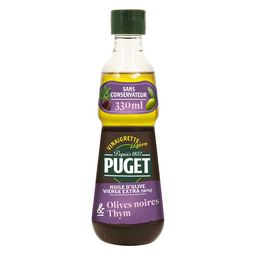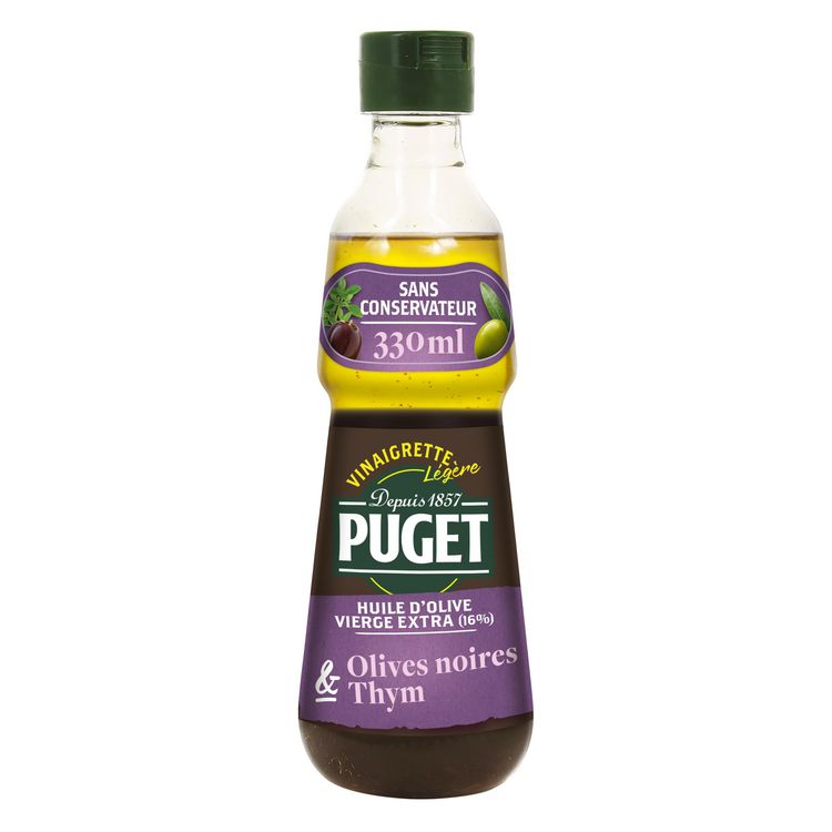 "La vinaigrette légère olives noires et thym et huile d'olive vierge extra (16%) PUGET est allégée en matières grasses*. Une vinaigrette qui rappelle les saveurs du Sud avec le mélange de l'olive noire et du thym. Une recette sans conservateur ! Elle est produite en France. *57% de matières grasses en moins par rapport à une vinaigrette classique à 75% de matières grasses. "