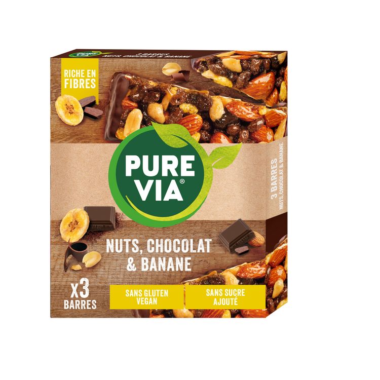 Les Barres de Céréales Pure Via® sans sucre ajouté sont élaborées avec des ingrédients de qualité et associent le croquant des cacahuètes grillées à la gourmandise du chocolat et de la banane. Elles sont riches en fibres pour un encas idéal à emporter partout.