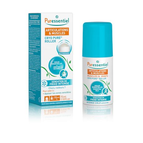 La bille de massage du CRYO PURE® Roller prodigue un massage décontractant qui, associé aux 14 huiles essentielles relaxantes, soulage efficacement, immédiatement et durablement les zones sensibles. Au menthol naturel, il procure un effet froid intense, rapide et durable. La méthode "cryo" est une application de froid traditionnellement utilisée. Efficacité approuvée - Testé sous contrôle dermatologique et kiné : - Effet froid intense, rapide et durable - Apaise les zones sensibles très pratique, ce roller à la texture non grasse et non collante permet un massage express sans se salir les mains. Le Roller articulations & muscles Cryo PURE®, l'automassage froid intense ! PRODUIT COSMÉTIQUE ISSU DE L'AROMATHÉRAPIE Huiles essentielles HEBBD (Huile Essentielle Botaniquement et Biochimiquement Définie) 100% pures et naturelles. Tolérance testée - Formule 99,6% d'origine naturelle - Sans colorant - Sans parfum de synthèse - Sans huiles minérales. Pour les zones étendues, découvrez le Gel Cryo Pure®. En savoir plus sur la gamme Articulations et muscles •La gamme Puressentiel® articulations et muscles décline les différents soins de santé, de confort et de bien-être pour lesquels les huiles essentielles ont des pouvoirs prouvés et reconnus scientifiquement. Ils associent des huiles essentielles en justes quantités pour garantir une parfaite sécurité d'emploi. Ils sont à base d'actifs 100% d'origine naturelle et d'huiles essentielles HEBBD (Huile Essentielle Botaniquement et Biochimiquement Définie) 100% pures et naturelles – sans colorant – sans conservateur – sans parfum de synthèse – sans huile minérale. • La gamme Puressentiel® articulations et muscles, a été formulée pour aider à soulager rapidement les douleurs articulaires, détendre et apaiser les contractures musculaires. Les vertus relaxantes, anti-raideurs et anti-gonflements de ses 14 huiles essentielles, associées à l'effet chauffant (Patchs), à l'effet décontractant (Bain) ou au massage (Roller, Gel et Baume calmant), garantissent un apaisement immédiat et un effet calmant durable. • La gamme Puressentiel® articulations et muscles est conseillée aux sportifs (avant et après l'effort), aux personnes ayant des sensations de douleurs ponctuelles ou récurrentes (survenant avec l'âge).