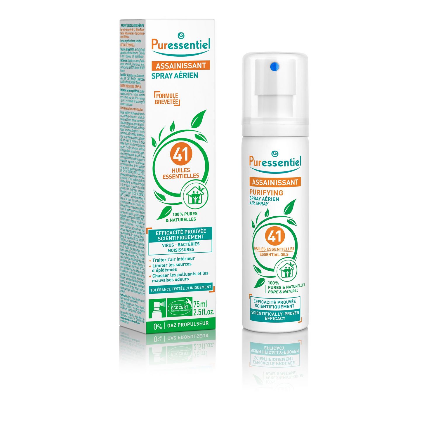 Le Spray Assainissant Puressentiel est une formule brevetée de 41 huiles essentielles 100% pures et naturelles. Efficacité prouvée : Elimine plus de 99,9% des bactéries et virus. Son efficacité a été scientifiquement prouvée sur les Virus, Bactéries et Moisissures. Il s'utilise dans toutes les pièces de vie (chambre, bureau, voiture) pour traiter l'air intérieur et les textiles tout en laissant un parfum frais et agréable. Sa tolérance a été testée cliniquement en milieu hospitalier. 100% Origine végétale Produit issu de l'aromathérapie aux huiles essentielles Botaniquement et Biochimiquement Définies : HEBBD Formule brevetée 100% des ingrédients sont d'origine végétale** Alcool végétal non dénaturé par des phtalates 0% gaz propulseur/colorant/parfum de synthèse EFFICACITÉ PROUVÉE PAR 12 ÉTUDES** • Efficace sur les virus de la grippe (H1N1), gastroentérite, sur Adénovirus Type 5 et Poliovirus Type 1 (EN 14476) • Efficace sur les souches bactériennes E.coli, P.aeruginosa, S.aureus, E.hirae (EN 1040) • Efficacité acaricide (dès 1h) et acarifuge à 7 jours - testé sur D.Pteronyssinus *Source Celtipharm : ventes pharmacies marché Assainissant : CA CAM Août 2016. ** Etudes scientifiques Puressentiel. ***Test de satisfaction réalisé sur 8969 consommateurs • Testé sur les levures et moisissures A.niger, C.albicans (EN 1275) La gamme Assainissant est une gamme complète à base d'actifs 100% d'origine végétale et d'huiles essentielles pour purifier l'air et désinfecter les mains et les surfaces. Découvrez nos gels hydroalcooliques et lotions sprays antibactériennes 3 huiles essentielles pour désinfecter les mains sans dessécher la peau. Nous nous attachons au quotidien à simplifier l'accès et l'utilisation des huiles essentielles avec des produits « prêts à l'emploi » sur lesquels figurent les modes et précautions d'utilisation. Nous nous appuyons sur plus de 500 études de tolérance et d'efficacité réalisées sur nos produits afin de vous proposer des solutions naturelles, efficaces et sûres pour vos petits maux du quotidien. Découvrez notre catalogue de produits "