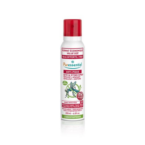 Le spray Anti-pique a une double action : Répulsif et Apaisant. - Répulsif : à base d'un puissant actif d'origine végétale dérivé de l'huile essentielle d'Eucalyptus citronné, il repousse efficacement les moustiques en zones infestées, tempérées et tropicales et d'autres insectes piqueurs (tiques, phlébotomes). Il est l'un des gestes possibles de protection notamment contre les vecteurs de zika, du paludisme, de la dengue, de la fièvre jaune, du chikungunya et de la maladie de Lyme. Efficacité testée en laboratoire : jusqu'à 7 heures* sur les moustiques tigres (Aedes albopictus) et communs (Culex pipiens), les phlébotomes (Phlebotomus duboscqi) ; jusqu'à 6 heures 30 sur les moustiques tropicaux (Aedes aegypti et Anopheles gambiae) ; jusqu'à 5 heures sur les tiques (Ixodes ricinus). La baignade ou la transpiration peuvent réduire la durée de protection. - Apaisant : Grâce aux 5 huiles essentielles BIO1 (Citronnelle de Java, Lavandin Grosso, Niaouli, Menthe Poivrée et Tea tree) pour procurer un effet apaisant sur les piqûres d'insectes. 0% insectifuge neurotoxique - Sans gaz propulseur Existe aussi en format 75ml *Efficacité testée en laboratoire : jusqu'à 7 heures sur les moustiques tigres (Aedes albopictus) et communs (Culex pipiens), les phlébotomes (Phlebotomus duboscqi) ; jusqu'à 6 heures 30 sur les moustiques tropicaux (Aedes aegypti et Anopheles gambiae) ; jusqu'à 5 heures sur les tiques (Ixodes ricinus). La gamme Anti-pique Puressentiel est votre bouclier 100% naturel contre les moustiques et autres insectes piqueurs: -Protéger votre peau avec les répulsifs cutanés Sprays (Bébé, 75ml,200ml et le spécial peaux sensibles 100ml à partir de 6 mois) -Protéger vos vêtements et tissus avec le spray répulsif vêtements et tissus idéal pour les vêtements, sacs de couchage, moustiquaires, rideaux, tentes poussettes... -Protéger votre maison avec le complexe diffuse citronnelle et les diffuseurs Puressentiel -Apaiser vos piqûres avec le roller apaisant cutané aux 11 huiles essentielles. Pratique et nomade il vous suivra partout. Pour les zones étendues, la crème-multi apaisante (30ml bébé et 40ml enfant à partir de 3ans) soulagera vos piqûres et démangeaisons.