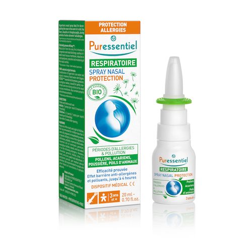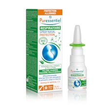 Ce spray Nasal protection allergies forme un film protecteur anti-allergènes (pollens, poussière, poils d'animaux) qui prévient les symptômes de la rhinite allergique tels que les éternuements, les écoulements nasaux et les démangeaisons nasales. Il diminue ainsi l'inflammation tout en préservant l'hydratation naturelle de la muqueuse nasale, de manière sûre et efficace. Cette formule d'origine naturelle, sans cortisone ni antihistaminique à base l'huile essentielle bio HEBBD d'eucalyptus associée à une solution saline et à un agent filmogène procure un confort immédiat avec une sensation de fraicheur apaisante. L'huile essentielle d'Eucalyptus radié est principalement reconnue pour ses propriétés décongestionnantes des voies respiratoires, fluidifiantes des sécrétions bronchiques et immunostimulantes Elle est traditionnellement utilisée contre les infections respiratoires. Le spray nasal Puressentiel respiratoire protection allergies avec son action douce non irritante et non desséchante a montré son efficacité contre la rhinite allergique aussi communément appelée rhinite saisonnière ou rhume des foins. Il est sans gaz propulseur, sans antihistaminique, sans cortisone et sans conservateur En cas de symptômes avancés de la rhinite allergique nous vous recommandons d'utiliser le spray nasal décongestionnant aux HE BIO 30ml rhinite allergique de la gamme Respiratoire Puressentiel. Il vous aidera à soulager tous vos symptômes (Eternuements, picotements, écoulements) pour vous permettre de passer le printemps sereinement. Puressentiel Respiratoire est gamme complète 100% naturelle pour aider à lutter contre les désagréments de l'hiver et les sensibilités saisonnières ! Découvrez . Evitez les sources d'épidémies et d'allergies avec le spray aérien aux 41 huiles essentielles. La protection 100% nature