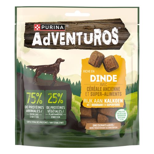 Quoi de plus satisfaisant que de donner à votre chien une friandise savoureuse et nourrissante, dont vous connaissez exactement la composition ! PURINA® AdVENTuROS a créé une friandise alléchante qui associe le Bison comme premier ingrédient, aux bienfaits d'une céréale ancienne naturelle comme le millet et de super-aliments tels que les pois et les cranberries, pour un goût d'aventure. Ces friandises, riches en protéines, sont composées d'ingrédients de qualité et sont sans colorants ajoutés et sans arômes et conservateurs artificiels ajoutés. Leur texture brute révèlera l'instinct d'aventurier de votre chien
