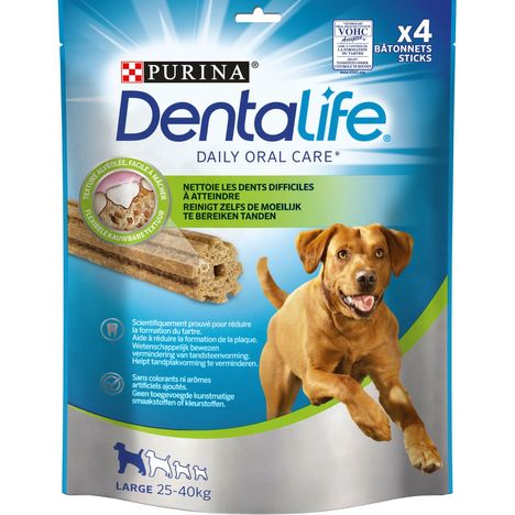 Votre chien a des besoins spécifiques et l’aider à maintenir une bonne hygiène bucco-dentaire contribue à son bien-être au quotidien. C’est pourquoi les experts PURINA ont développé Purina® DentaLife™, un bâtonnet à mâcher innovant, scientifiquement prouvé pour aider à nettoyer même les dents les plus difficiles à atteindre, qui sont les plus touchées par la formation du tartre et de la plaque. Nos bâtonnets à mâcher sont conçus pour un usage quotidien, pour plus d’efficacité. Adoptez dès aujourd’hui le reflexe Dentalife au quotidien. Aliment complémentaire pour chiens de grande taille adultes.