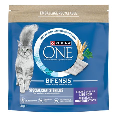 PURINA ONE BIFENSIS est une formule nutritionnelle unique contenant des bactéries fonctionnelles bénéfiques, les Lactobacillus. Scientifiquement prouvée, leur action renforce le système immunitaire de votre chat de l'intérieur et contribue ainsi à protéger son microbiome intestinal.. PURINA ONE BIFENSIS contient des ingrédients de haute qualité, dont un prébiotique : la chicorée. Celle-ci nourrit les bonnes bactéries de l'intestin, afin d'améliorer le microbiome intestinal de votre chat pour le maintenir en bonne santé.. Une digestion saine, un système immunitaire fort et un pelage soyeux, constatez des résultats visibles sur la santé de votre chat aujourd'hui et demain.