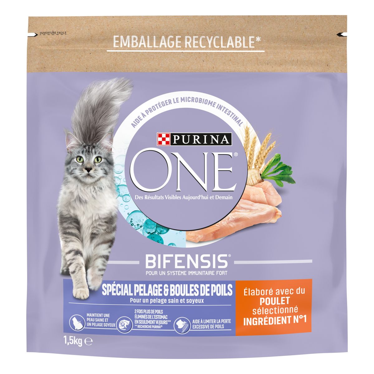 PURINA ONE Adulte est une recette nutritionnellement adaptée aux besoins des chats âgés de 1 an et plus.Avoir un microbiome intestinal équilibré est essentiel pour la bonne santé de votre chat, car il a un impact direct sur son système immunitaire. Le microbiome est un écosystème contenant des trillions de micro-organismes qui vivent dans l'intestin et sont uniques à chaque chat. L'équilibre des micro-organismes est important pour soutenir la bonne santé digestive, le système immunitaire et le bien-être général de votre chat. PURINA ONE BIFENSIS est une formule nutritionnelle unique contenant des bactéries fonctionnelles bénéfiques, les Lactobacillus. Scientifiquement prouvée, leur action renforce le système immunitaire de votre chat de l'intérieur et contribue ainsi à protéger son microbiome intestinal. PURINA ONE BIFENSIS contient des ingrédients de haute qualité, dont un prébiotique : la chicorée. Celle-ci nourrit les bonnes bactéries de l'intestin, afin d'améliorer le microbiome intestinal de votre chat pour le maintenir en bonne santé. Une digestion saine, un système immunitaire fort et un pelage brillant, constatez des résultats visibles sur la santé de votre chat aujourd'hui et demain.