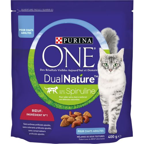 PURINA ONE DualNature est formulé avec des ingrédients de haute qualité, dont du boeuf comme ingrédient N°1.Un mélange savoureux de croquettes croustillantes et de croquettes à la texture plus tendre, contenant des protéines de haute qualité, source d'acides aminés, pour aider à maintenir une digestion saine. Aliment complet pour chat adulte