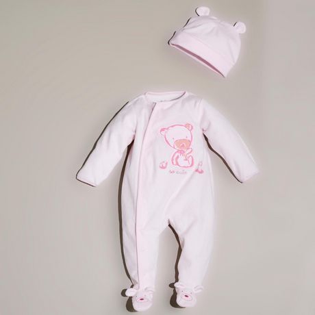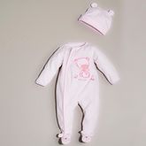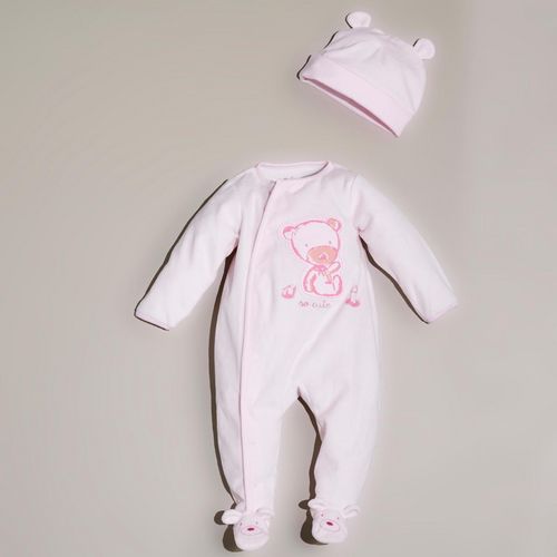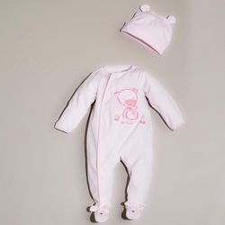 Bébé sera vraiment craquant avec ce pyjama et ce bonnet rigolos In Extenso ! Toucher doux d'un velours lisse. On adore : les petites oreilles sur le bonnet et sur les pieds du dors bien bébé. Pyjama avec grand ours appliqué sur le devant et broderie sur les pieds. Ouverture asymétrique pression