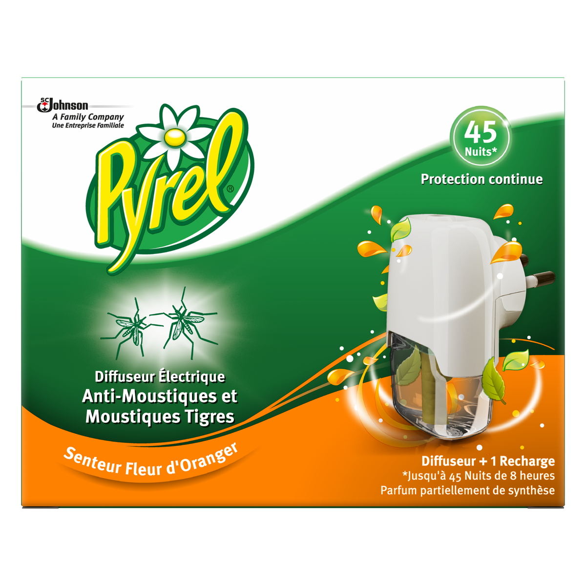 Le diffuseur électrique Pyrel® 45 nuits senteur fleur d'oranger et sa recharge liquide vous protégent efficacement contre les moustiques et les moustiques tigres jusqu'à 45 nuits de 8 heures.