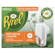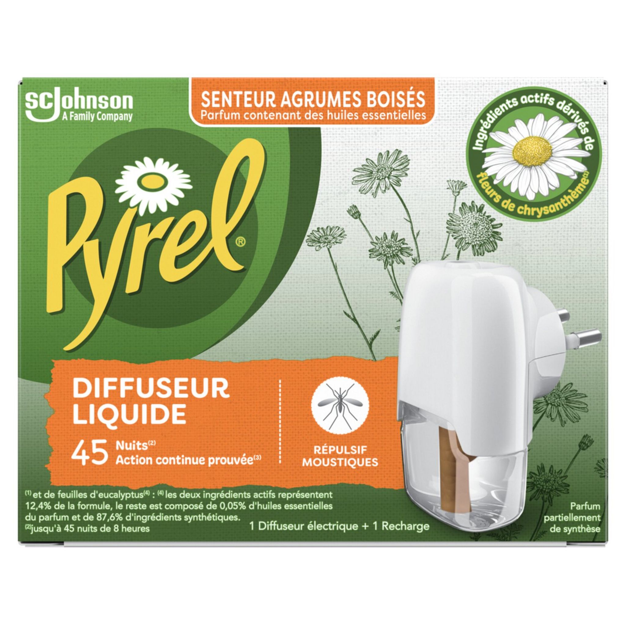 Ne laissez plus les moustiques impacter votre sommeil ! Repoussez-les avec le diffuseur électrique liquide senteur* agrumes boisés Pyrel®, la protection contre les moustiques l’esprit tranquille ! Sa formule contient des ingrédients actifs dérivés de fleurs de chrysanthème et de feuilles d’eucalyptus pour repousser les moustiques jusqu'à 45 nuits de 8 heures**. *Parfum contenant 9,1% d’huiles essentielles. (parfum partiellement de synthèse). **Efficacité testée en laboratoire sur l'inhibition d'atterrissage des Moustiques et Moustiques Tigres (Culex et Aedes Albopictus). Utilisez les produits répulsifs avec précaution. Avant toute utilisation, lisez l’étiquette et les informations concernant le produit.