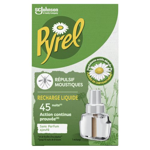 Pyrel® Diffuseur Liquide Répulsif Moustiques Senteur Agrumes boisés vous protège contre les moustiques et les moustiques tigres en les repoussant grâce à sa formule élaborée avec des ingrédients actifs à base de plantes. Ces ingrédients dérivés de fleurs de chrysanthème et de feuilles d’eucalyptus sont